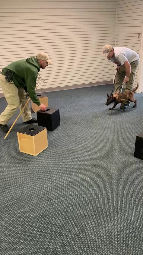 When starting a dog on narcotics you have to find something they absolutely adore, like a tennis ball. We have a little black box that has a hole through the top. We place any kind of drug into the box. We also place the tennis ball in there but that gets placed on an electronic spring. When letting the dog go sniff it and when they look at it, we let the tennis ball go and they are now allowed to play with the ball. This way they associate a tennis ball with that smell. When they are getting the smell down we get them to sit at the box the powder is in to let us know when they have found it.